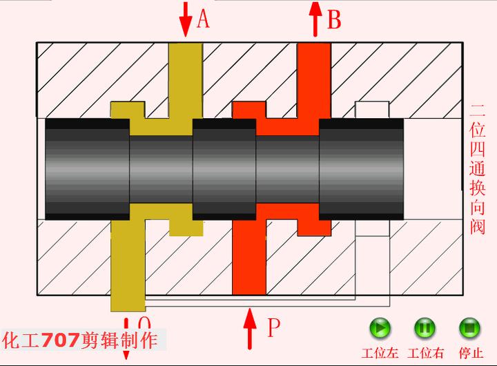 当阀芯移到右位时,P与A通,B与O通;